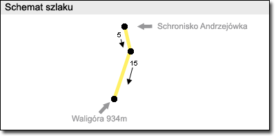 Żółty szlak na Waligórę kieruje się ze schroniska na południe do pobliskiego rozstaju. Na rozwidleniu w prawo odchodzi niebieski szlak, który pozwala wejść na Waligórę okrężną drogą. Znaki żółte prowadzą dalej wprost zalesionym zboczem. Podejście jest krótkie, ale bardzo intensywne z uwagi na bardzo dużą stromiznę. Kopuła szczytowa jest w całości zalesiona przez co jest pozbawiona jakichkolwiek widoków. Sam szczyt to zalesione wypłaszczenie, na którym znajduje się kamienna tablica z oznaczoną wysokością 936 metrów, choć oficjalna wysokość spotykana aktualnie na mapach to 934 metry. Nie chcąc schodzić tą samą drogą, można podążać dalej za znakami żółtymi, które sprowadzają do Rozdroża pod Waligórą.